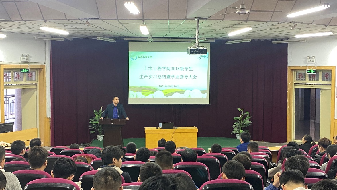 2021年10月14日下午,9728太阳集团在学校学术二厅召开2018级学生生产实习总结暨学业指导大会。土木工程、农业水利工程、工程管理三个本科专业学生,学院领导、综合办公室、教研室主任及全体教师近200多人生参加了会议。会议由副院长肖让主持。