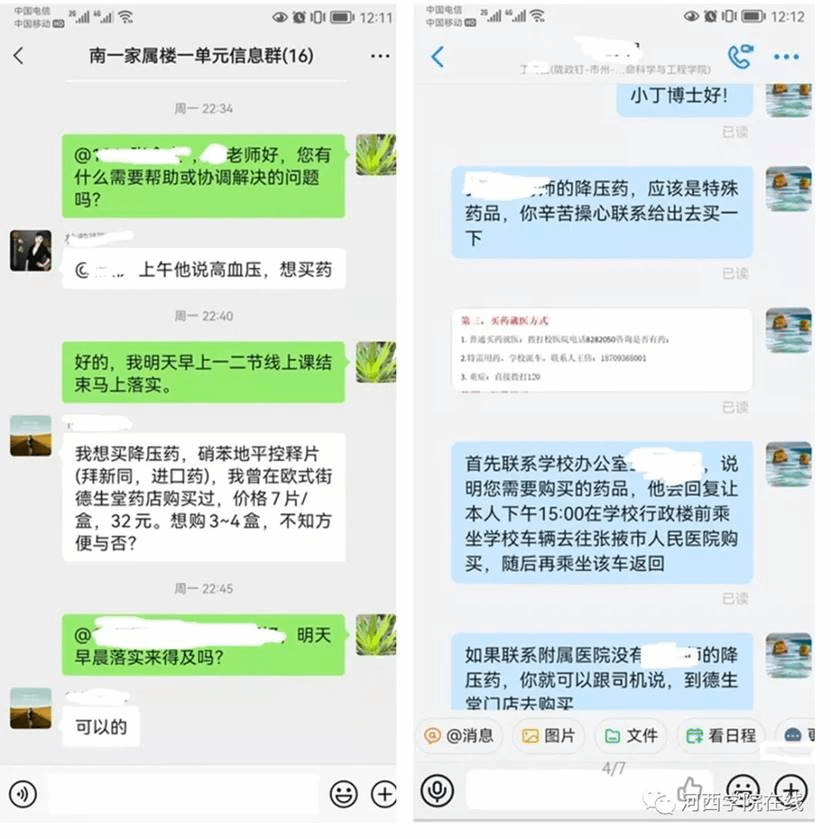 在家属区楼长岗位上担当作为。学院负责人还具体负责南区家属区1号楼1单元住户疫情防控工作。因南区1号家属楼外租人员多,人员构成相对复杂,工作起来困难较大,就一单元来说,有教职工,外聘教授,毕业生,家属以及食堂工作人员30人,但为了全校的疫情防控大局,他们千方百计,确保不落一户,不漏一人。尽心尽力的做好每一件事,服务每一个人的基本需求。外聘教授张某某老师高压药没有了,他用药又是专用药物。通过对接张教授,了解基本情况和药物的具体信息后,积极与聘请学院联系,安排专人按照学校外出程序,启用应急车辆,在最短时间内联系购买到外聘教授的用药;2号中午,考研租住户3名毕业生储备食物没有了,积极联系申请安稳部,解决好三位同学基本食物供给的问题……
